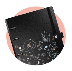 Os florais em cores suaves se destacam de forma sutil, proporcionando o perfeito equilíbrio entre os tons. Enquanto o hot stamping rosê gold, adiciona o toque final de refinamento ao produto.